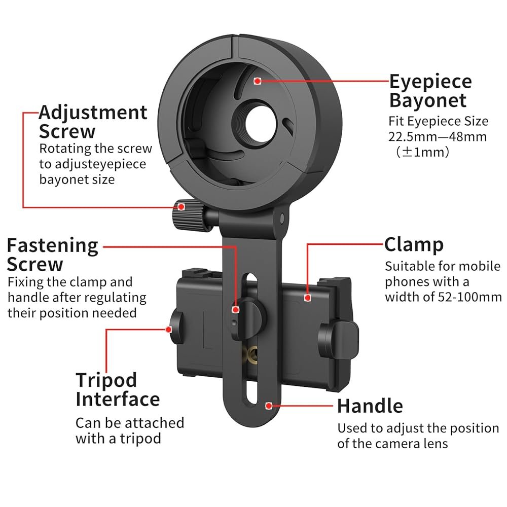 Phone Compatibility Problemsarise from size or camera placement differences. Verify your phone fits the adapter’s clamp snugly. Some phones with large cameras or cases may not fit well. Remove bulky cases or use adapters made for your phone model for best results.